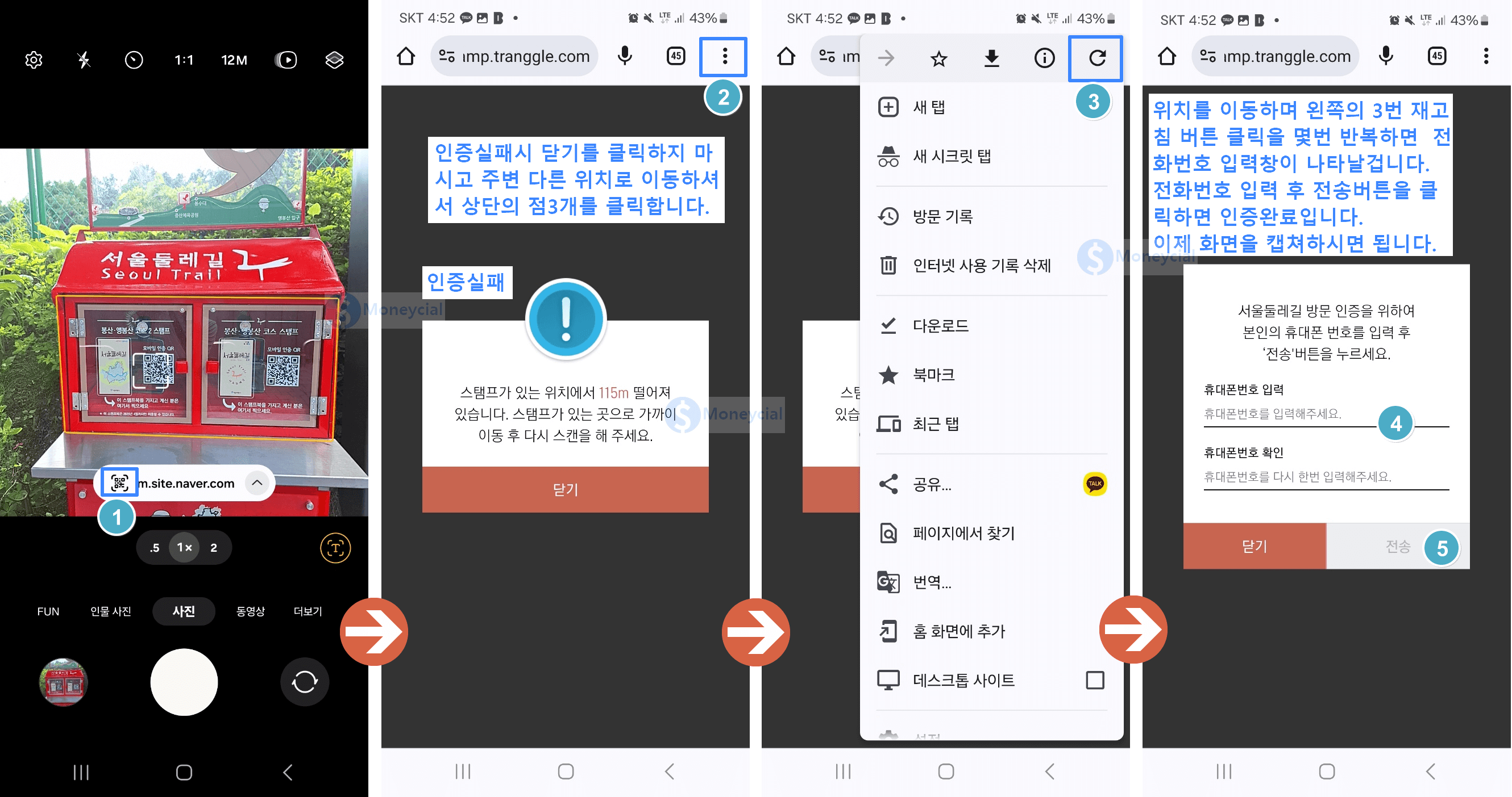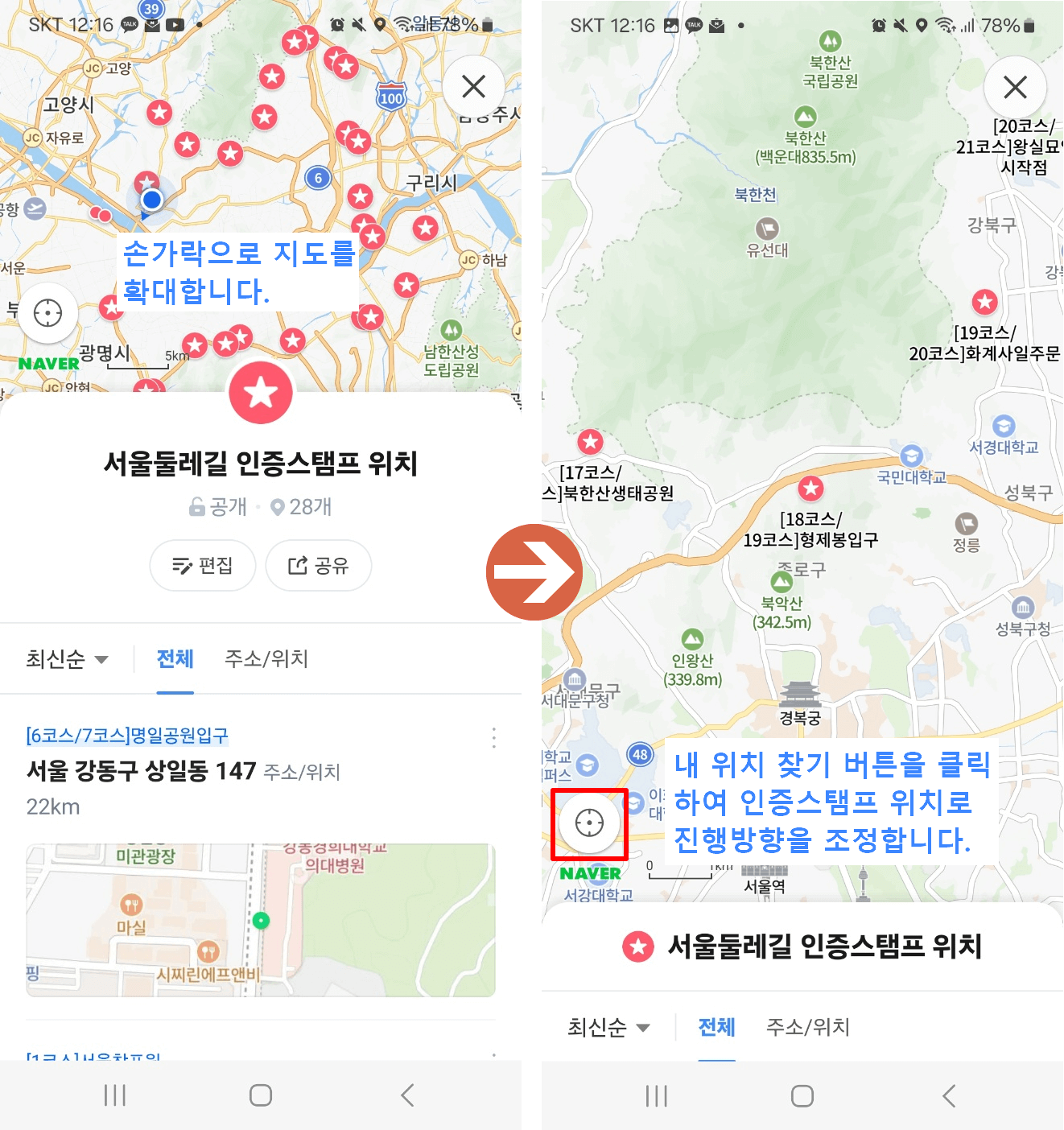 서울 둘레길 코스완주 인증은 빨간우체통에서 스탬프북에 스탬프를 찍거나 부착된 QR코드로 진행합니다. 인증스탬프(빨간우체통) 위치는 네이버지도의 기능을 활용하여 확인하고 진행방향을 조정하였습니다.