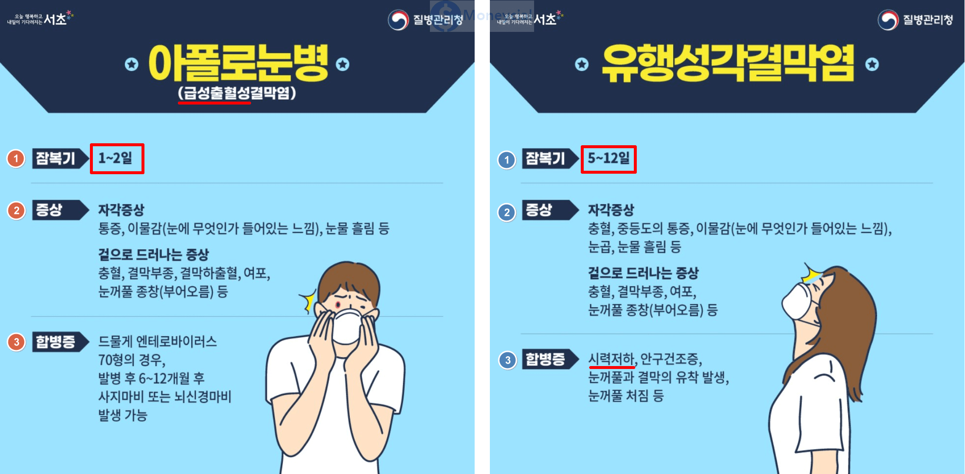 여름철 대표적인 감염병으로 수족구병과 아폴로 눈병이 있습니다. 여름철 감염병이지만 미리미리 유행할 감염병에 대해 알아두고, 예방법을 익혀 좋은 습관을 만들어 둔다면 올여름을 건강하게 날 수 있을 겁니다. 이에 여기에 수족구병과 아폴로 눈병의 증상과 예방조치에 대해 알려드리겠습니다. (출처 : 서초구 공식블로그)